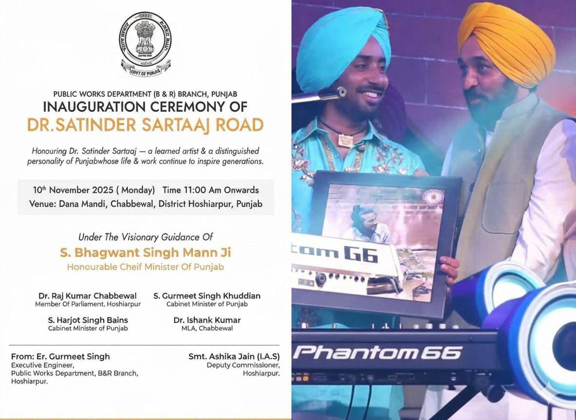 पंजाब सरकार ने मशहूर सूफी गायक और कवि डॉ. सतिंदर सरताज को सम्मानित करते हुए होशियारपुर जिले के चब्बेवाल क्षेत्र की एक प्रमुख सड़क का नाम उनके नाम पर रखने की घोषणा की है.